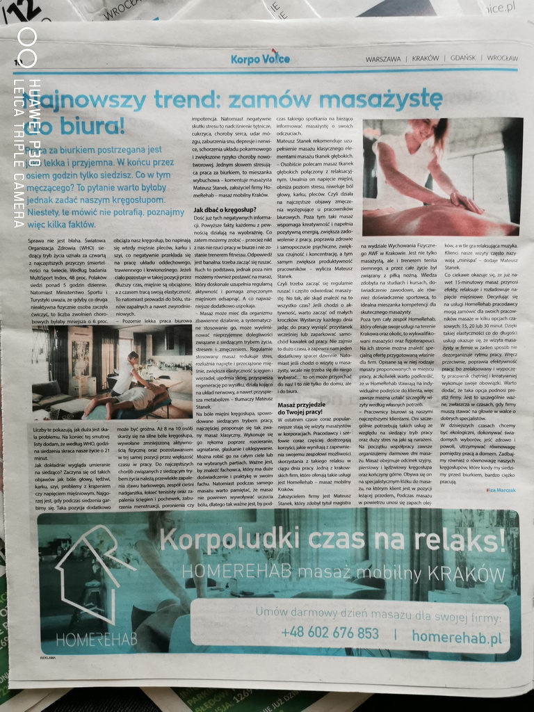 W nowym wydaniu miesiecznika Korpo Voice ukazał się materiał na temat naszej firmy HomeRehab masaż mobilny Kraków. Korpo Voice to gazeta bezpłatna, raz w miesiącu rozdawana jest bezpośrednio pod największymi biurowcami w Polsce, prosto do rąk wchodzących do nich pracowników. Głównym tematem wywiadu był ostatnio popularny temat, a zarazem nasza specjalność. czyli masaż z dojazdem do miejsca pracy w Krakowie.