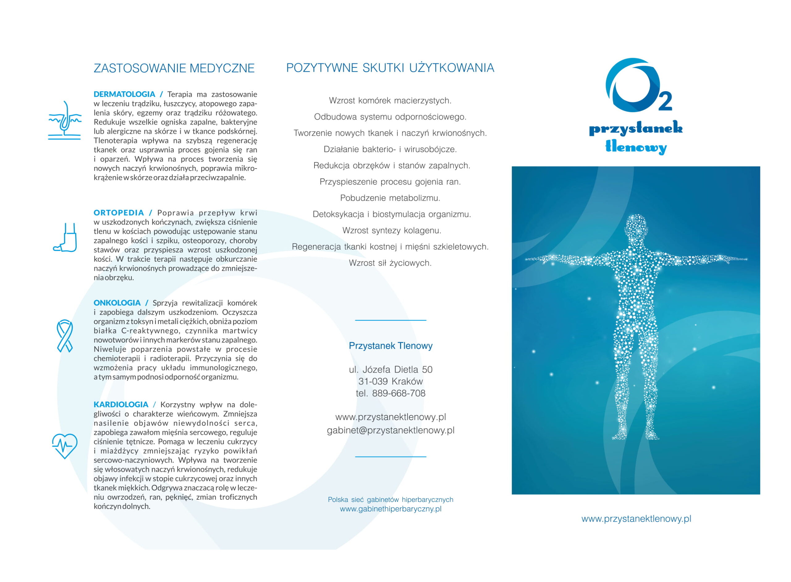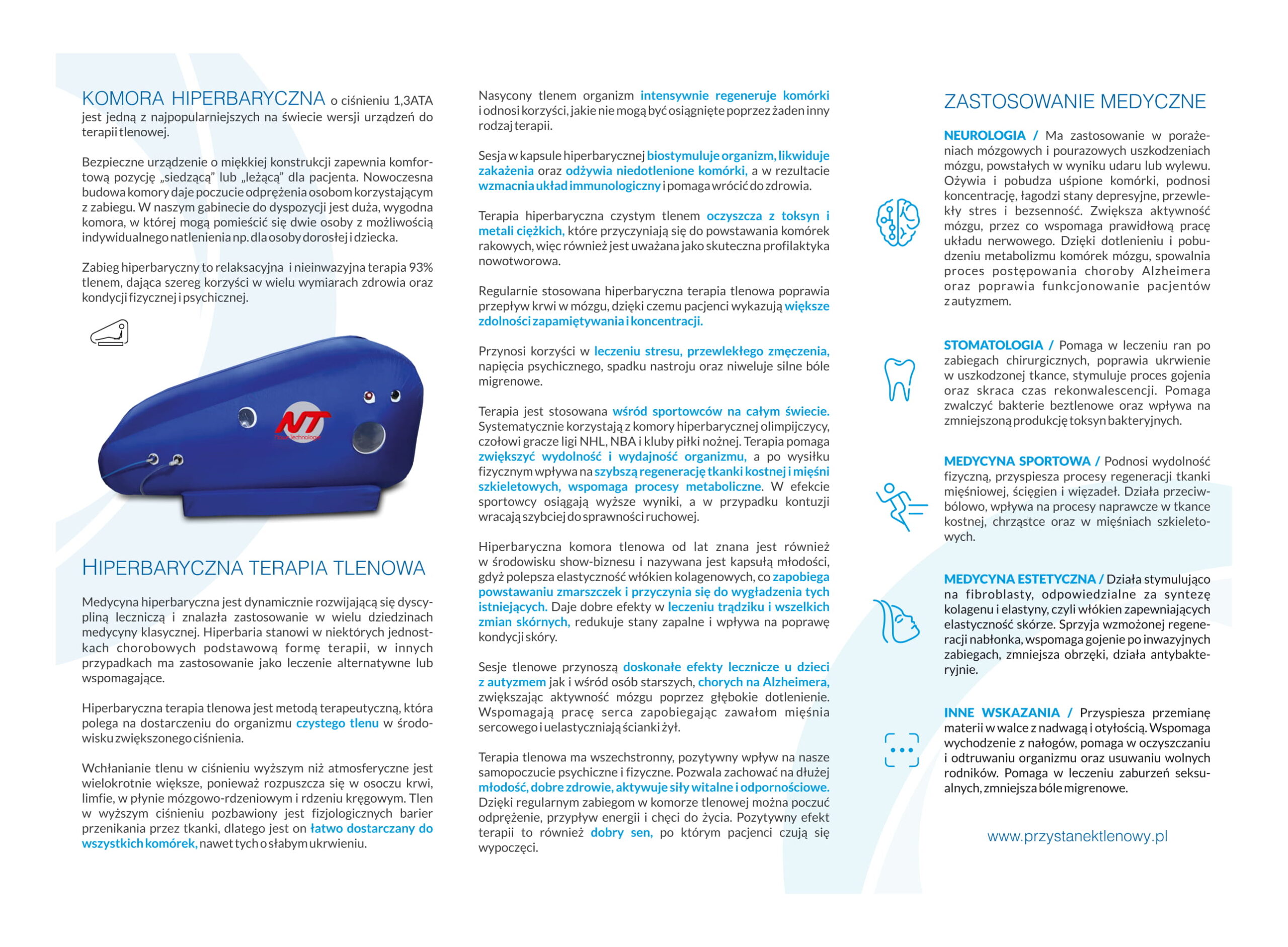 Idealna forma uzupełnienia planu treningowego o kolejną formę regeneracji. Serdecznie zapraszamy do zapoznania się z ofertą naszego partnera. “Przystanek Tlenowy” Jest to niewątpliwie nowoczesna i bardzo ciekawa forma odnowy biologicznej oraz profilaktyki zdrowotnej. Nasz partner zajmuje się Tlenoterapią w komorze hiperbarycznej o ciśnieniu 1,3 ATA, która ma wszechstronny pozytywny wpływ na nasze samopoczucie psychiczne i fizyczne, pozwala zachować na dłużej młodość, dobre zdrowie, aktywuje siły witalne i odpornościowe. Dzięki regularnym zabiegom w komorze tlenowej można poczuć odprężenie, wpływ energii i chęci do życia pozytywne efekty terapii to również dobry sen, po którym pacjenci czują się wypoczęci. W medycynie sportowej podnosi wydolność fizyczną, przyspiesza proces regeneracji tkanki mięśniowej, ścięgien i więzadeł. Działa przeciwbólowo, wpływa na procesy naprawcze w tkance kostnej, chrząstce oraz w mięśniach szkieletowych. Natomiast w medycynie estetycznej działa stymulująco na fibroblasty, odpowiedzialne za syntezę kolagenu i elastyny, czyli włókien zapewniających elastyczność skórze. Sprzyja wzmożonej regeneracji nabłonka, wspomaga gojenie po inwazyjnych zabiegach, zmniejsza obrzęki, działa antybakteryjnie. Ponadto przyśpiesza przemianę materii w walce z nadwagą i otyłością. Wspomaga wychodzenie z nałogów, pomaga w oczyszczaniu i odtruwaniu organizmu oraz usuwaniu wolnych rodników. Pomaga w leczeniu zaburzeń seksualnych, zmniejsza bóle migrenowe.